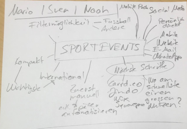 Wir haben uns zu Beginn der Lektionen für zwei Ideen entschieden .Die eine war die Sport-App, die andere die Online Schulbücher. Nach der Besprechung haben wir uns definitiv für die Sport-App entschieden. Im Anschluss konkretisierten wir unsere Ideen und Vorstellungen und begannen mit der Planung.